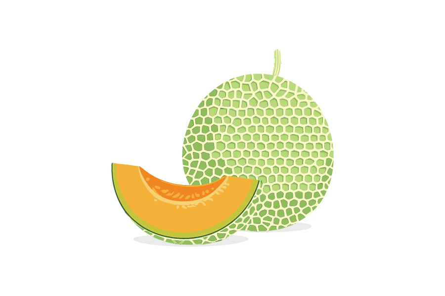 メロン丸ごとと、カットした赤肉などのメロンの組み合わせをイラストにしました。