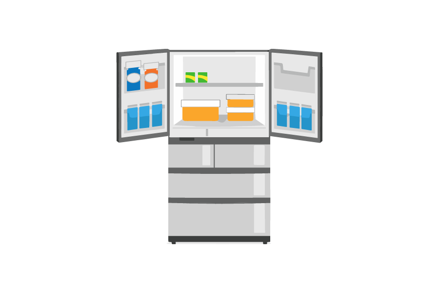 家庭用の大型冷蔵庫の扉が開いている状態をイラストにしました。