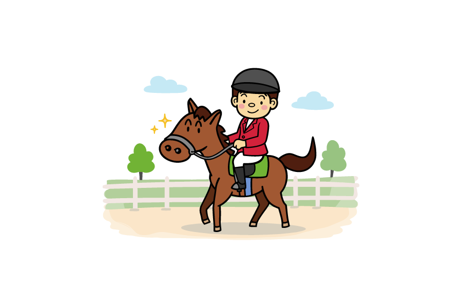 乗馬シーンをやさしいタッチで描いたベクター素材です。無料・商用利用可で、Web制作、ブログ、広告、資料作成など幅広い用途に対応。スポーツ・習い事・動物テーマのコンテンツ制作に使いやすいイラストです。